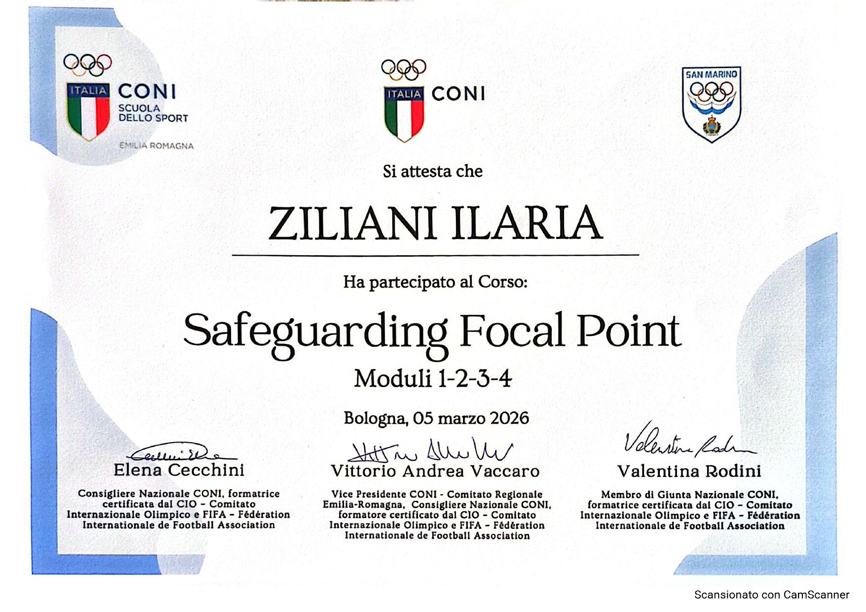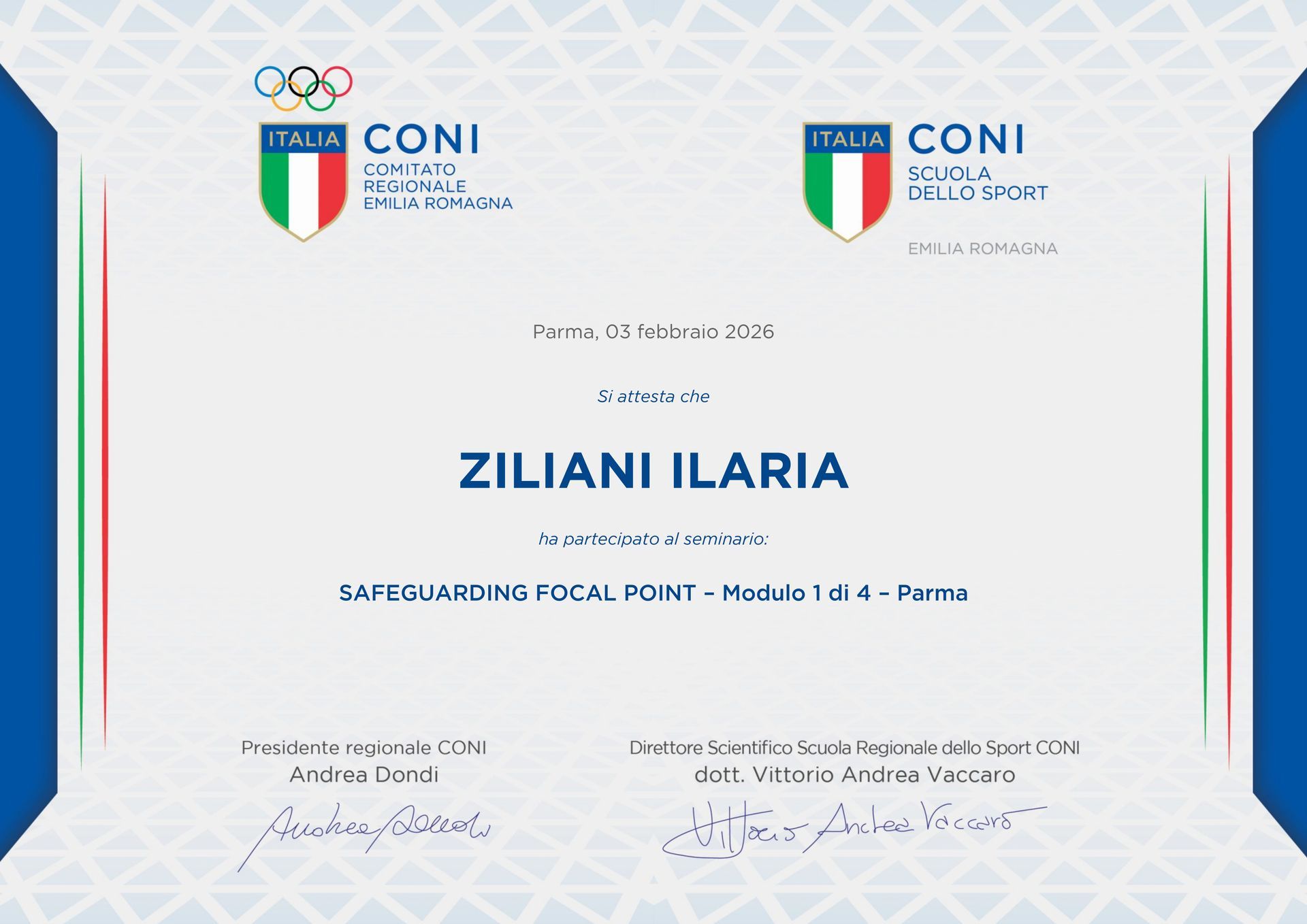 Ha frequentato diversi corsi tra cui Workout di Mental Training con Michele Surian nel 2015 e il corso di aggiornamento tecnici con la Scuola Nazionale e Formazione di Roma (SNF) tra gennaio e marzo 2022.