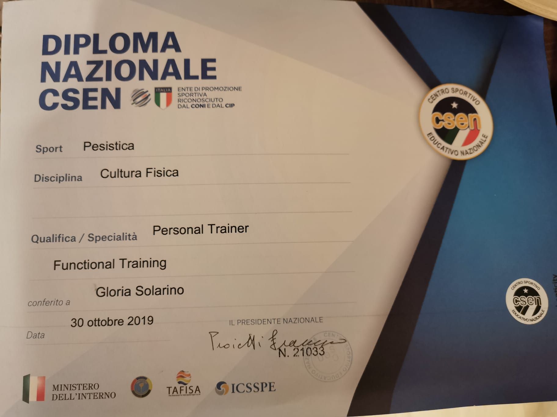 Solarino Gloria arriva a Parma nel settembre 2011 per iniziare gli studi di Laurea in Scienze motorie, sport e salute. Da grande appassionata di sport inizia ad approcciarsi alla kickboxing conquistandone la cintura gialla, ma viene deviata dal provare a praticare rugby agonistico femminile di seria A presso Colorno.Contemporaneamente conosce l’allenamento funzionale WTA praticato presso l’ASD Fight Academy dagli istruttori Comelli C., Chiesa L. e Carillo R.Questa metodologia d’allenamento la aiuta nella prevenzione da infortuni nello sport del rugby e la rende forte ed interessata ad intraprenderne un percorso formativo presso la WTA functional academy.